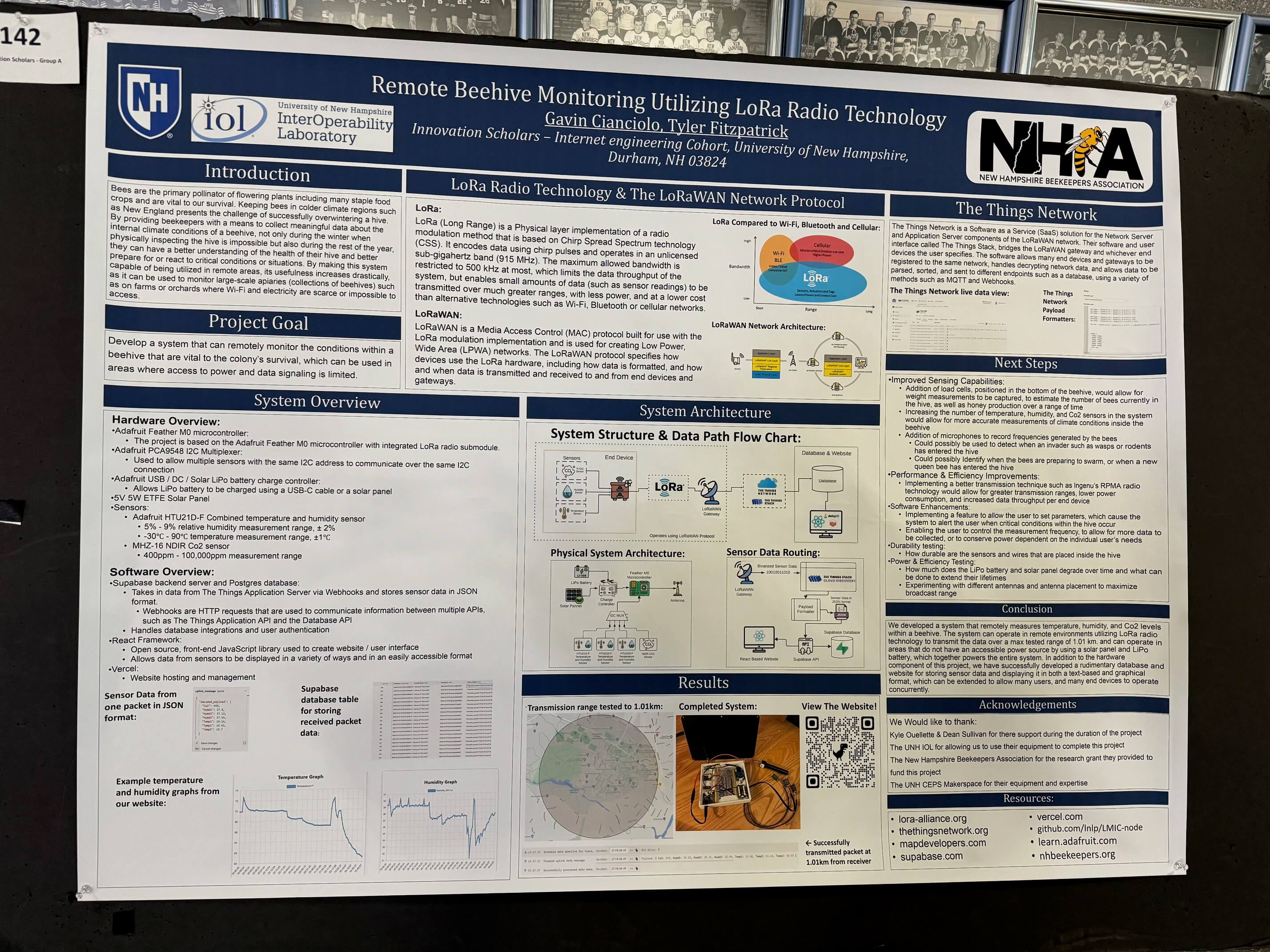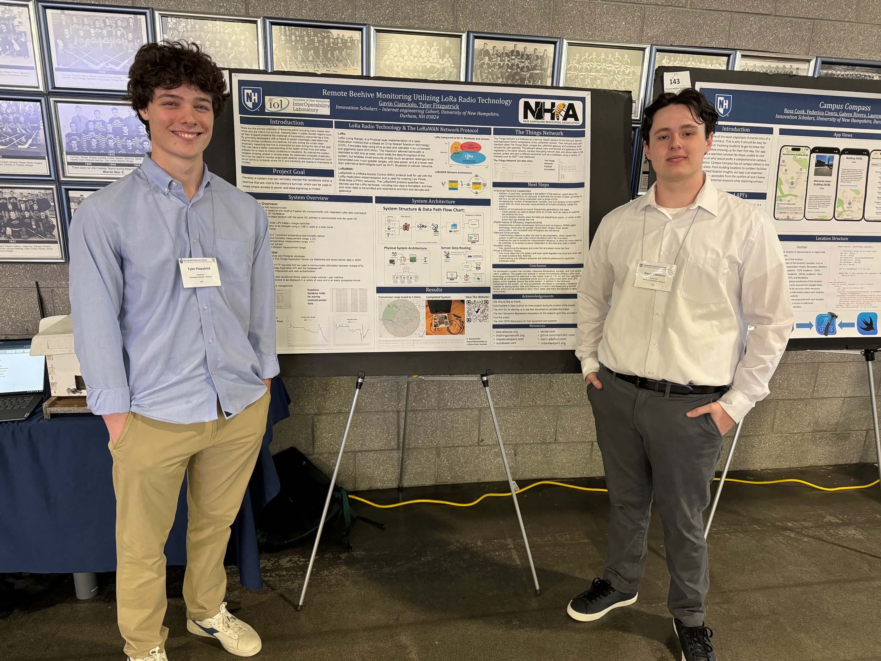 Michael Lesser, NHBA Research Chair, got back from the UNH undergraduate research conference where one of our research grant awardees (Gavin Cianciolo) had a poster on his progress developing TยฐC, RH and CO2 sensor package for beehives. ย See attached photo of poster, and poster with Tyler Fitzpatrick (left) and Gavin (R). ย